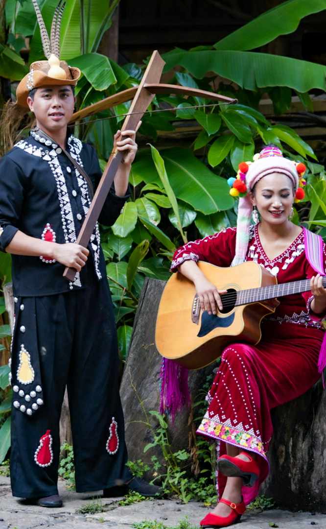 德昂族人口約1.7萬,主要分布在德宏州和保山市的潞西、梁河、瑞麗、隴川、隆陽等縣區。民居多為草排覆頂竹木結構的干欄式建筑,眼前的德昂村建筑納入了能容納數十人居住的德昂大房子,氈帽頂的小房子,還有頗具浪漫色彩的大公房、小公房……還建有“龍陽塔”標志及佛教奘房、佛塔。德昂族民間普遍信奉南傳佛教,民俗活動與佛事活動關聯緊密。潑水節(jié)、開門節(jié)、關門節(jié)是重大節(jié)日。德昂族服飾色彩豐富,口頭文學特別是民歌創作活動...